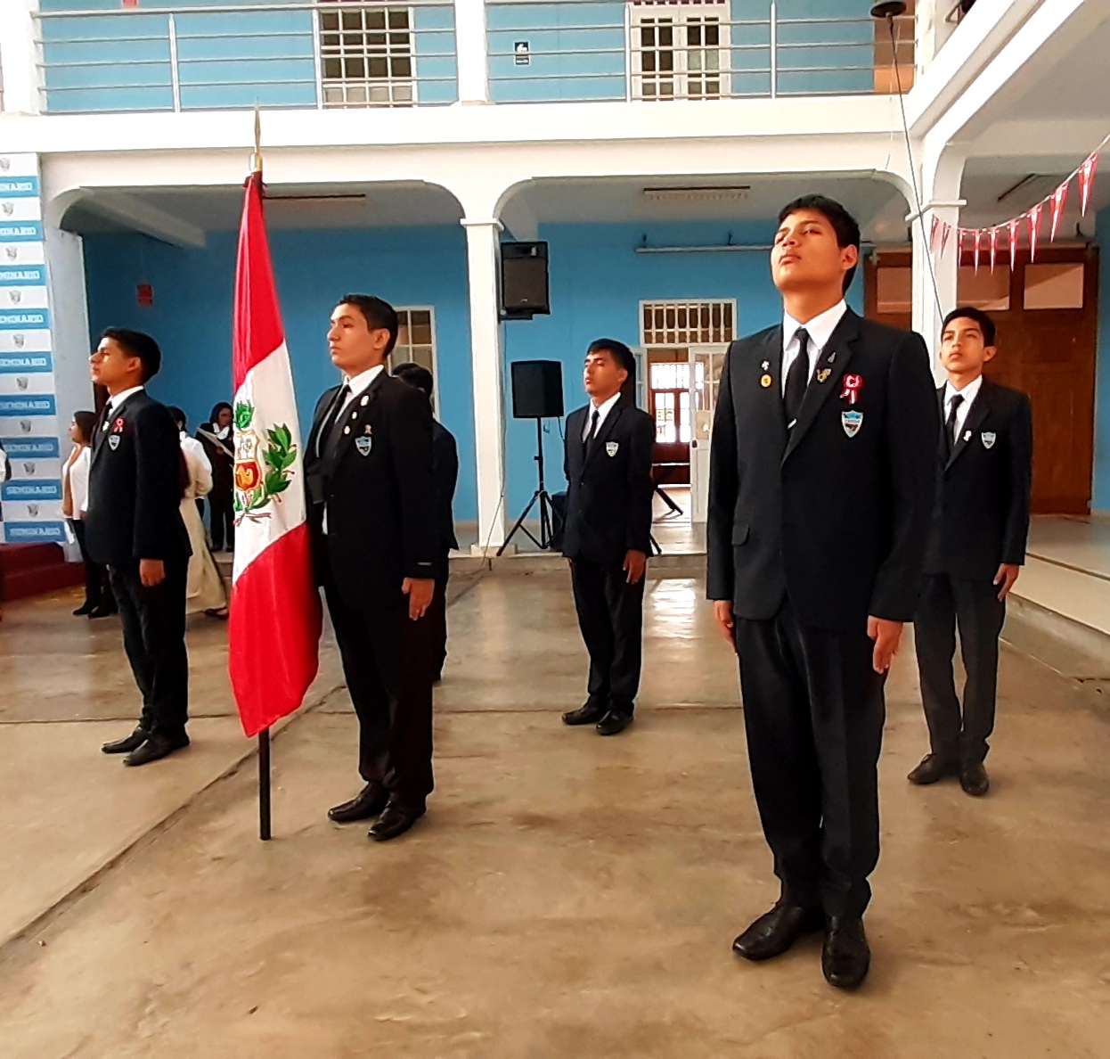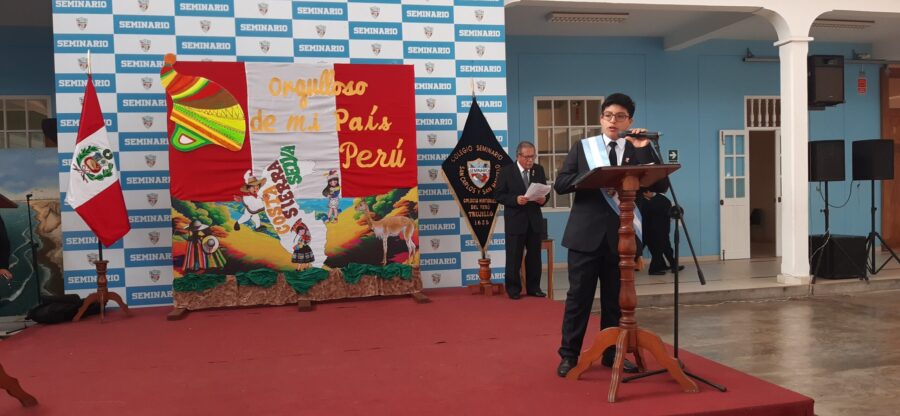 Con la asistencia de la familia educativa seminarista en pleno, los estudiantes saludaron al Perú. El discurso estuvo a cargo de nuestro alcalde escolar Nicolas Gordillo Golac, se dieron poemas y canciones, culminando con la escenificación de la proclamación de la independencia del Perú, con el asesoramiento del Prof. Aldo Polti Del Campo, en un marco de pregones y escenas costumbristas, con una enérgica proclamación de la independencia, se dio por culminada la ceremonia de saludo.
