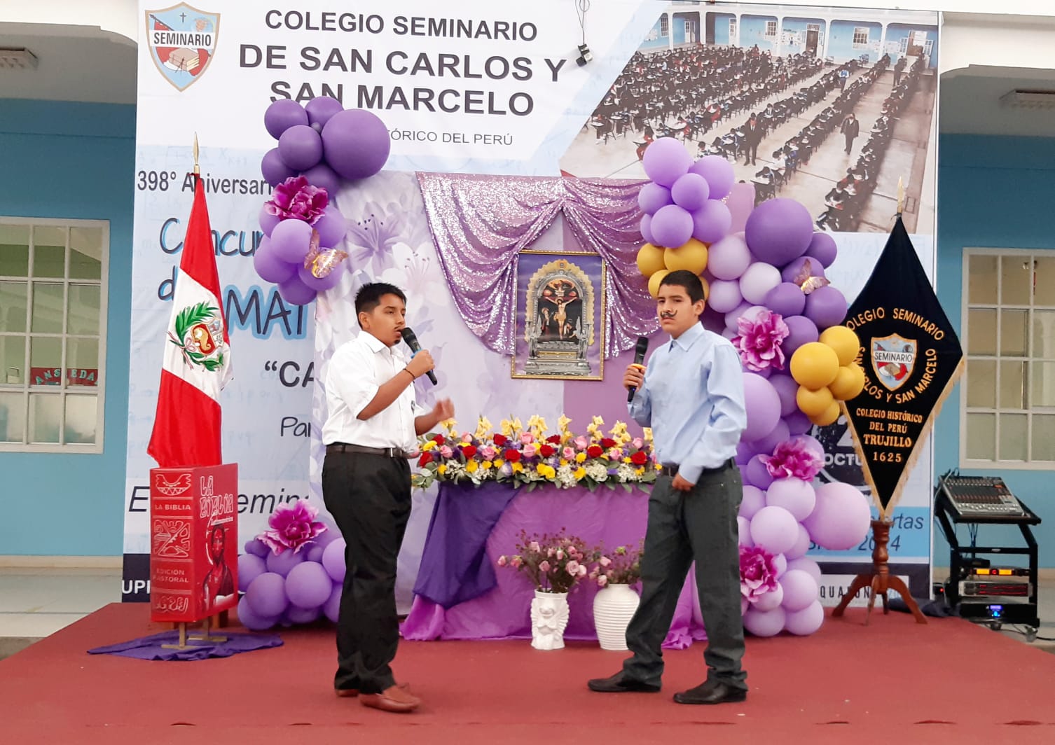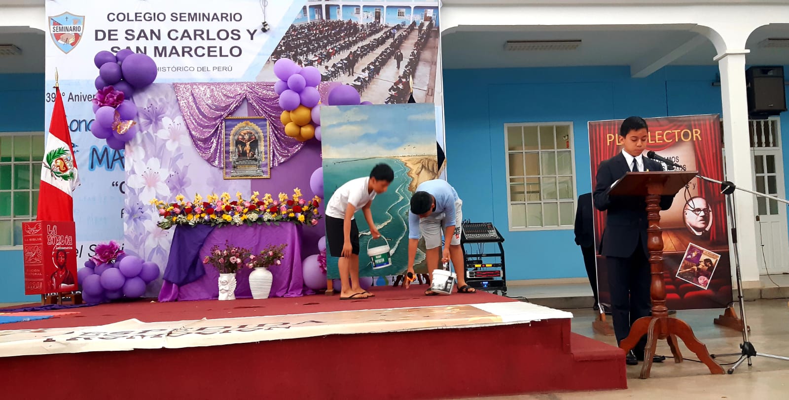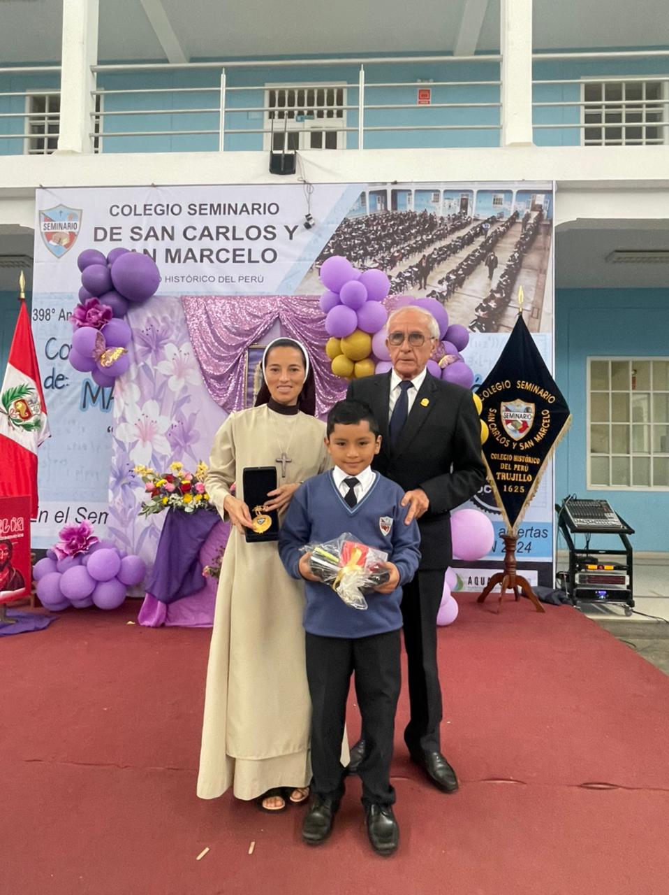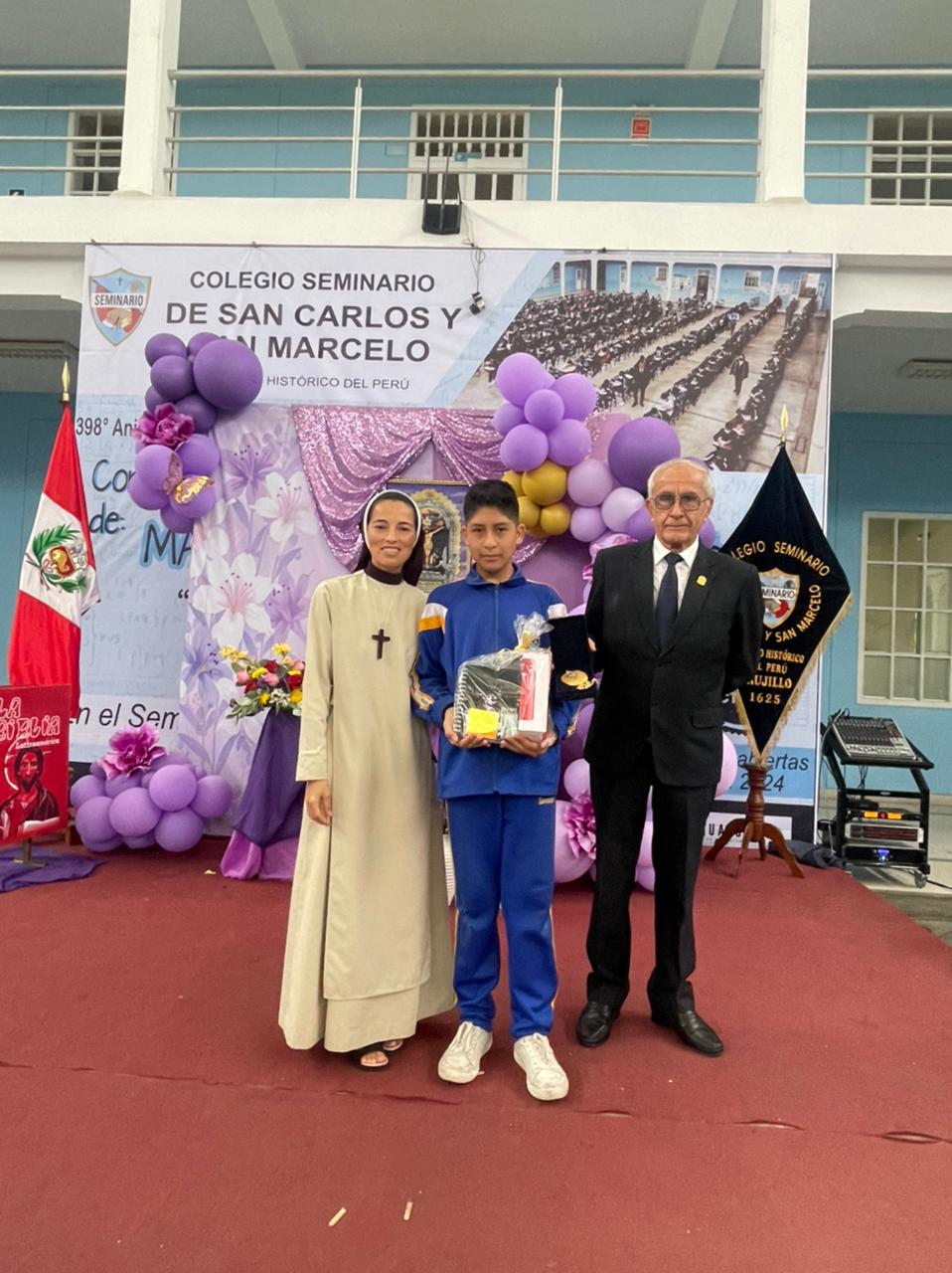 También se han premiado a los mejores lectores de la Biblioteca Móvil Seminarista. Fue Mathias Tapia Merino quien destacó la importancia de la lectura. Los estudiantes Thiago Mezones de 5º B de Primaria y Elvis Diego Vázquez Bocanegra de 1º B de Secundaria, recibieron presentes y medalla, de manos de Hna. Nubia Flores Alvarado, Directora del Colegio Seminario. Felicitaciones a la docente María Arteaga Basilio, que realiza diariamente el acompañamiento del proyecto “La biblioteca móvil”.