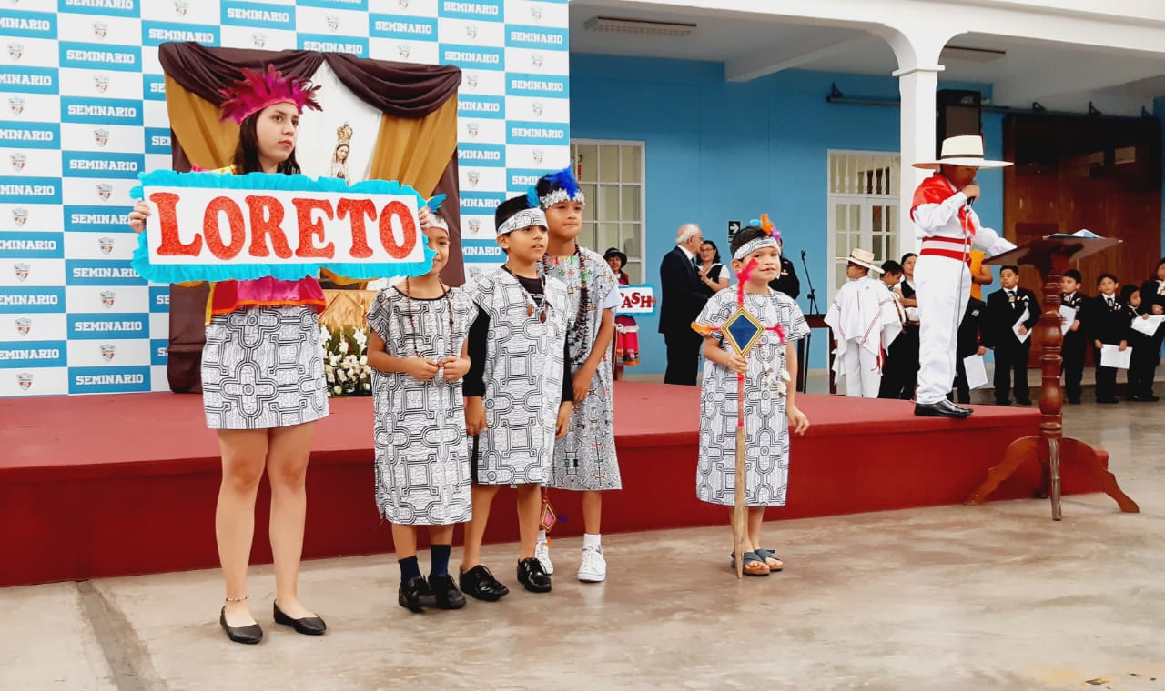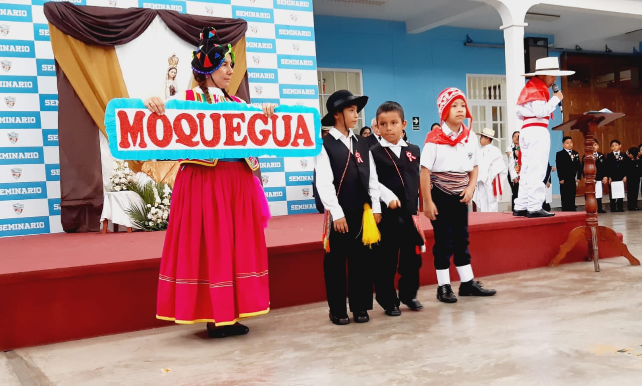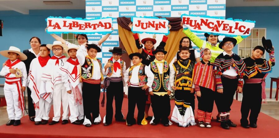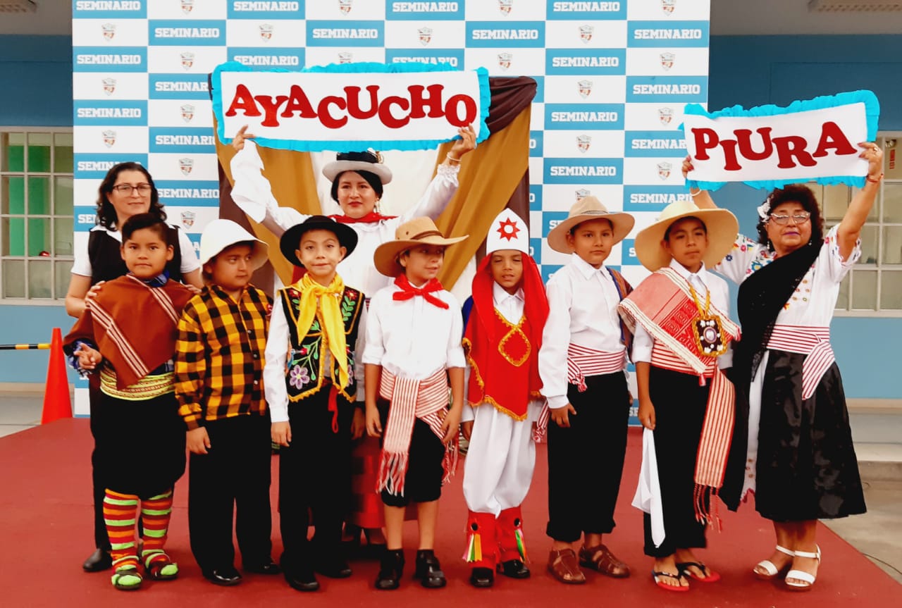 El miércoles 19 de julio, los niños de 3º A, 3º B, 4º A y 4º B de Primaria, asesorados por Prof. Fany Echevarría, Prof. María Abanto R. mostraron trajes típicos de la costa, sierra y selva, como: Poncho, Pollera, Chullo, Ojotas, Poncho costeño y capuz, La cushma, una túnica amplia cocida a los costados, adornada con tintes y figuras geométricas, propia de la selva.